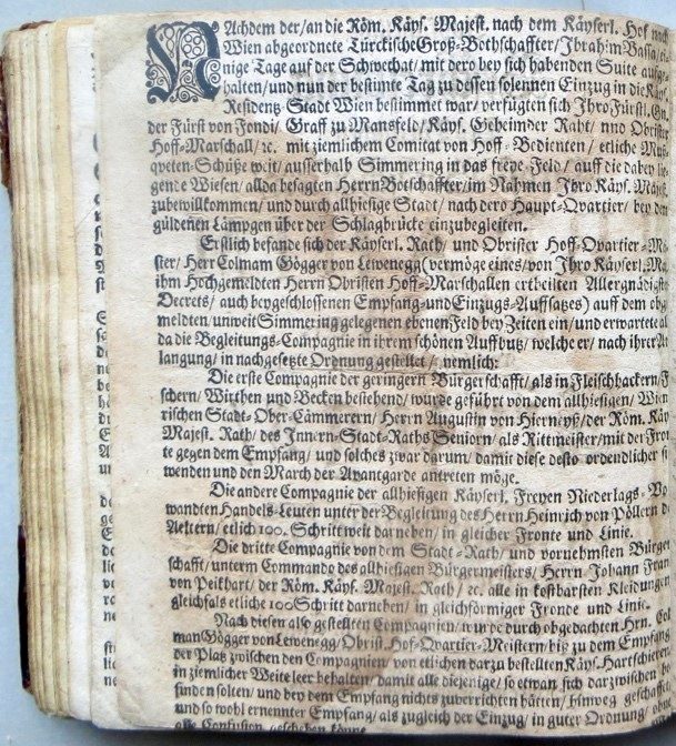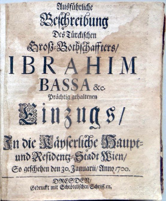 Mit dem Text „Ausführliche Beschreibung des Türckischen Groß-Bothschaffters/ IBRAHIM BASSA & C. prächtig gehaltenen Einzugs/ In die Kayserliche Haupt- und Residenz-Stadt Wien/ So geschehen den 30. Januarii/ Anno 1700. DRESDEN/ gedruckt mit Schroetelischen Schrifften“ endet das vorliegende zwischen Pappdeckeln mit Ledereinfassung gebundene Buch.