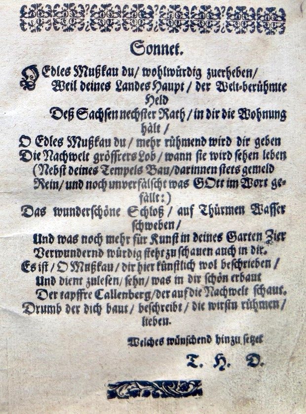 Das auf der nächsten Seite abgedruckte Sonett ist mit den bisher nicht aufgelösten Buchstaben T. H. D. unterschrieben. Danach folgen 856 über Muskau gedichtete Zeilen, womit Johann Caspar Crusius als Kirchenpoet in die Geschichte einging. Ab Zeile 67 sind die später noch oft zitierten, die Stadt Muskau auf drei wichtige Dinge reduzierten Verse nachzulesen.