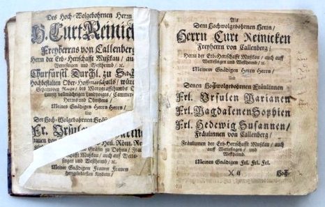 Hier endet die Kirchen-Zierde, jedoch dieses Buch nicht, denn es folgen noch viele Anhänge. Eine handschriftliche Abschrift vom „Recess. Die Abtretung Ober und Nieder Lausitz betrefende ao. 1633“ endet mit „Johann George Chur Fürst zu Sachsen, Prag 20. May 1630.“ Dem schließt sich der „Extract einer von Abrahamo Hossmano-Laubanensi Lusato Sax. Majest. Historico“ 1615 in Muskau hinterlassenen Chronik an. Diesen Abraham Hosemann aus Lauban (1561 – 1617) bezeichnete der Archivar und Historiker Colmar Grünhagen (1828 – 1911) nicht ohne Grund als „Schlesischen Lügenschmied,“ deshalb übergehen wir dieses 71 Seiten umfassende Machwerk. Danach schließen sich die vom Standesherrn Curt Reinicke von Callenberg 1664 und 1666 erlassenenen Verordnungen, darunter das Bier-Urbar an.