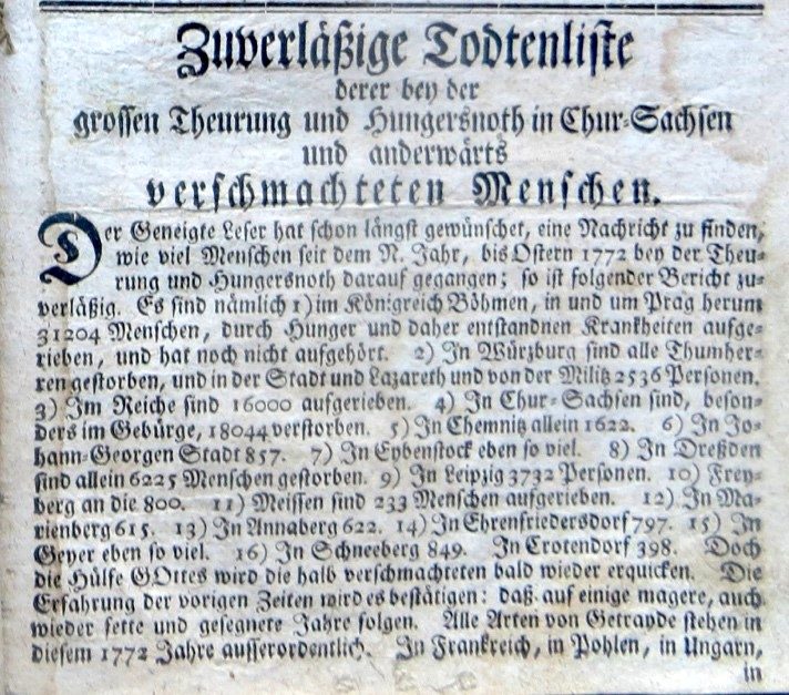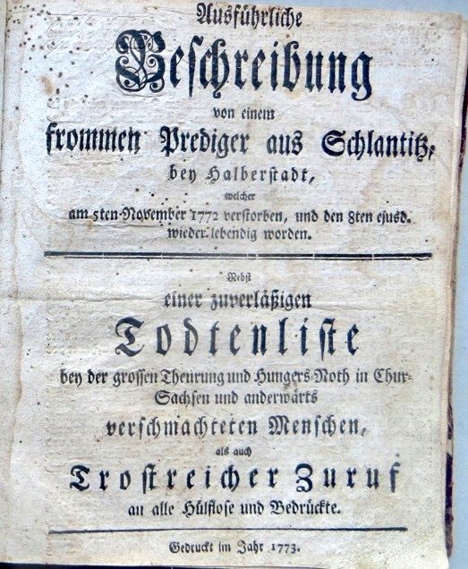Es schließt sich eine „Ausführliche Beschreibung von einem frommen Prediger aus Schlantitz bey Halberstadt – nebst einer zuverläßigen Todtenliste derer bey der grossen Theuerung und Hungersnoth in Chur-Sachsen und anderwärts verschmachteten Menschen“ an. Da sich weder der Ort Schlantitz noch der Name des Predigers identifizieren ließ, könnte es sich wohl um einen bewusst anonym gedruckten Text handeln.