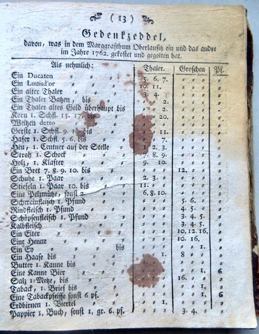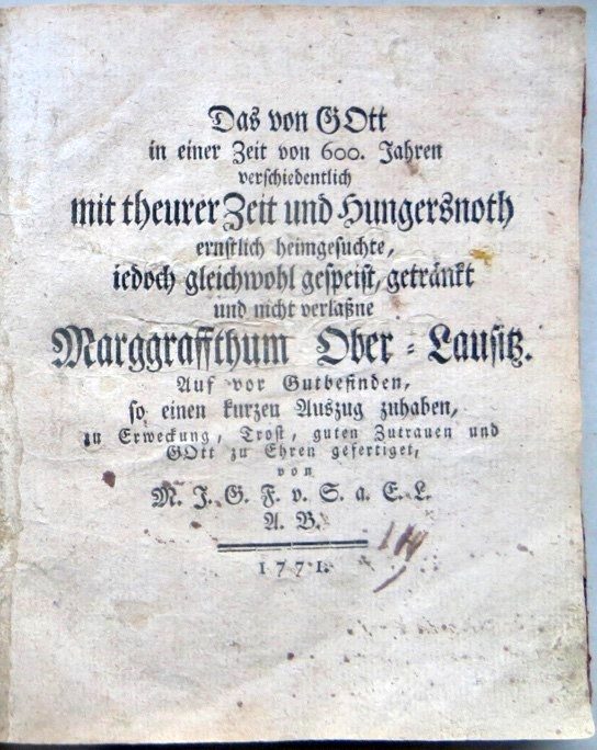 Dann folgen wieder gedruckte Texte, zuerst über „Das von Gott in einer Zeit von 600. Jahren verschiedentlich mit theurer Zeit und Hungersnoth ernstlich heimgesuchte, iedoch gleichwohl gespeist, getränkt und nicht verlaßne Marggraffthum Ober-Lausitz“ von Johann Gottlieb Frenzel (1715 – 1780) aus dem Jahr 1771. Darin befindlich ein „Gedenkzeddel, davon, was in dem Marggrafthum Oberlausitz ein und das andere im Jahre 1762. gekostet und gegolten hat.“
