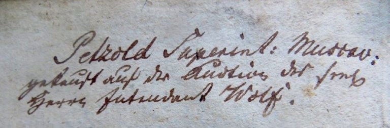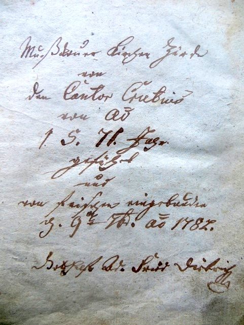 Die beiden Einträge auf der Innenseite des Buches erzählen von seinen Besitzern. Die „Mußkauer Kirchen Zierde von dem Cantor Crusius von ao. 1571. Jahr geführt und von frischen eingebunden d. 9. 7br. [September] ao. 1782“ mit der Unterschrift des in Muskau 1750 geborenen, doch ohne Beruf aufgeführten, Gotthelf Ad[olph] Fried[rich] Dietrich. Der zweite Eintrag besagt, dass der Muskauer Superintendent Carl Petzold (1783 – 1866) dieses Buch im Jahr 1831 aus dem Nachlass des Fürstlich Pücklerischen Schlossintendanten Ludwig Traugott Heinrich Wolf (1750 – 1831) erworben hatte. Nach Petzolds Tod kam es in den Besitz der Evangelischen Gesamtkirchengemeinde Bad Muskau-Gablenz. Da es meist nur für lokale Abnehmer bestimmt war, hatte es sicher nur eine kleine Auflage und zählt heute als Rarität. Neben der Kirchen-Zierde von 1671 beinhaltet dieser Bücherschatz weitere Handschriften und gedruckte Texte, deren Inhalt historisch nicht weniger bedeutsam sind und weiterer Bearbeitung harren.