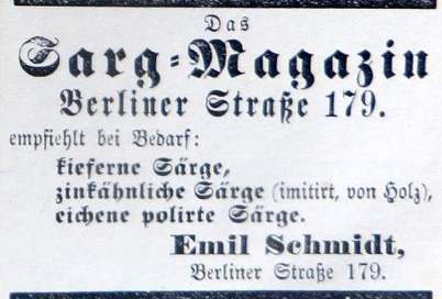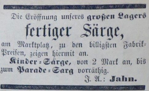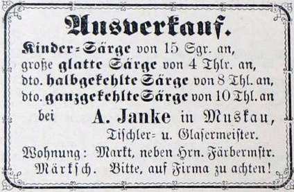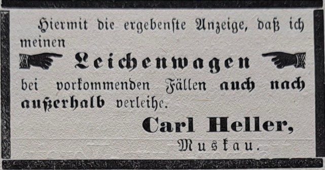 Auf den Bedarf an Särgen hatten sich die Muskauer Handwerker stets gut eingestellt. Der Sattlermeister Carl Heller stattete einen für das Begräbnis angeschafften Leichenwagen aus. Dieser Wagen kam am 30. Januar 1886 bei der Beerdigung der 70-jährigen Adele Hehn geb. Bartickow – Witwe des Rittergutsbesitzers in Dubraucke – erstmalig zum Einsatz. „Außerdem hat, wie wir hören, Herr Heller noch einen besonderen Wagen für Kinderleichen angeschafft.“16