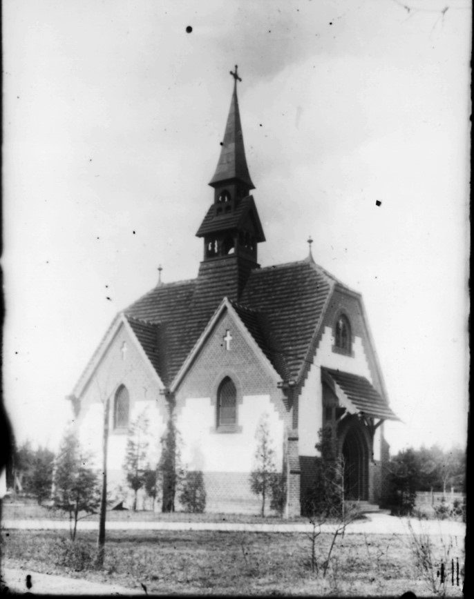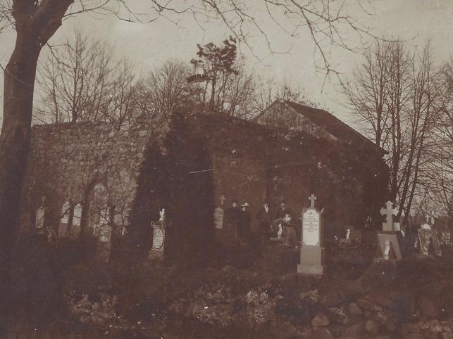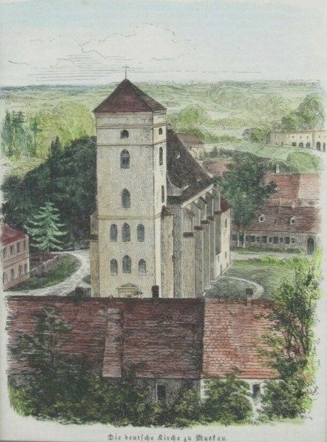 Um die oberhalb der Stadt gelegene Feldsteinkirche – vermutlich um 1200 erbaut – befand sich seit Errichtung der Muskauer Stadtkirche der Gottesacker des Dorfes Berg. Auf diesem durften bis zur Anlage der eigenen Friedhöfe auch die Bewohner der ebenfalls zum Kirchspiel Muskau gehörenden Dörfer Krauschwitz und Weißwasser ihre Verstorbenen beerdigen lassen, da sie dem Ort Berg entfernungsmäßig nahe lagen.2