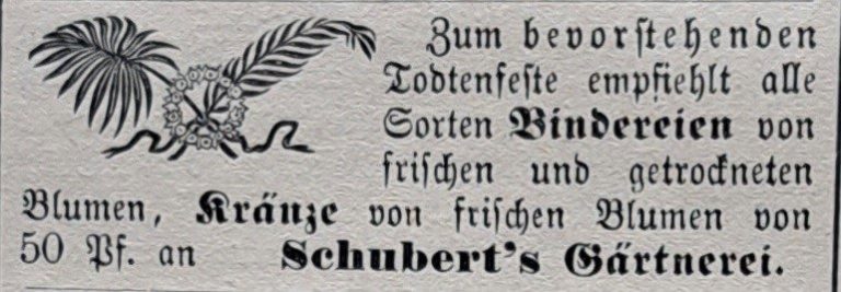 Wer es sich leisten konnte, ließ für seine Verstorbenen eine Trauerannonce sowie eine Danksagung im Muskauer Anzeiger veröffentlichen. Der Handelsgärtner August Schubert versorgte die Stadt nicht nur mit Pflanzen, Obst und Gemüse, sondern fertigte sowohl frischen als auch getrockneten Trauerschmuck an. Das besondere Angebot der Gärtnerei zum Totensonntag beinhaltete gebundene Kränze, Bouquets, Kronen, Anker, Kreuze sowie Palmenzweige.