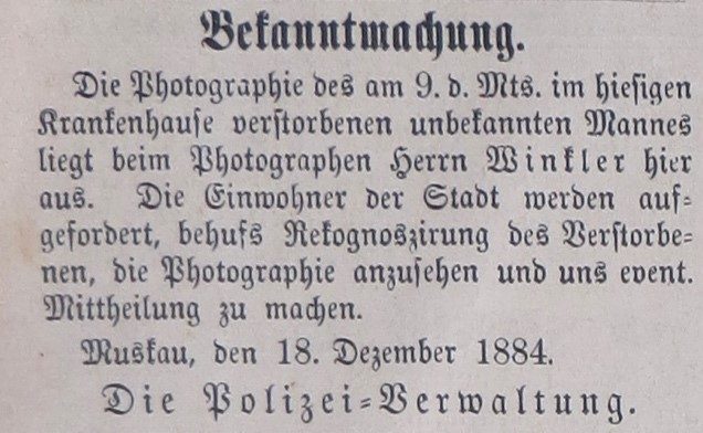 1884 ereignete sich auf „hiesigem Kirchhofe“ ein Selbstmord, wobei nicht klar ist, ob der Platz um die Kirche oder an der Jakobskapelle gemeint ist. „Am 9. d. Mts. [Dezember], Abends gegen 7 Uhr, erschoß sich mittels eines Revolvers auf hiesigem Kirchhofe, nur wenige Schritte rechts vom Eingange entfernt, ein fremder, gut gekleideter Mann im Alter von etwa dreißig Jahren.“14 Da ihn der Schuss nicht gleich getötet hatte, hörten Vorübergehende seine Klagelaute. Ins hiesige Krankenhaus transportiert, verstarb er nach drei Stunden, ohne dass er etwas über seine Person bekannt gab. Auch in seiner Kleidung waren keine Hinweise zu finden. Selbst aus seiner Leibwäsche hatte er die Zeichen entfernt. Die Polizeiverwaltung ließ den Toten zwecks Identifizierung vom Hoffotografen Bernhard Winkler ablichten und das Foto auslegen. Am 31. Dezember 1884 gab die Behörde den Toten als den 24-jährigen Julius Klär, Sohn eines Lehrers in Ober-Siegersdorf bei Freistadt in Schlesien, bekannt.15
