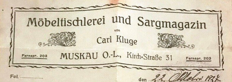 Briefkopf von Möbeltischlerei und Sargmagazin Carl Kluge, Muskau 1927