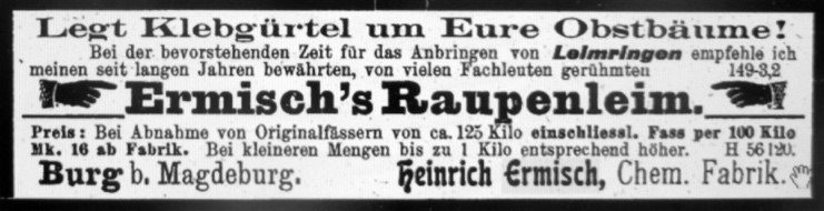 Im darauffolgenden Jahr kam Kontinuität ins Röten und Leimen, jedoch zeigte der Leim der Firma Ermisch ein Nachlassen der Klebequalität und -dauer. Die 1812 gegründete Fabrik von Heinrich Ermisch in Burg bei Magdeburg stellte neben Öl, Fett und Carbolineum den gefragten Raupenleim her. Den vom Muskauer Forstamt angezeigten Qualitätsmangel erkannte Ermisch durch Reduzierung des Rechnungsbetrages an.