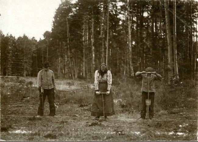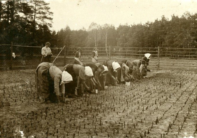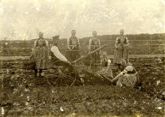 wendische Waldarbeiterinnen mit der Hackerschen Verschulmaschine, 1906/08