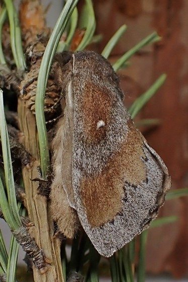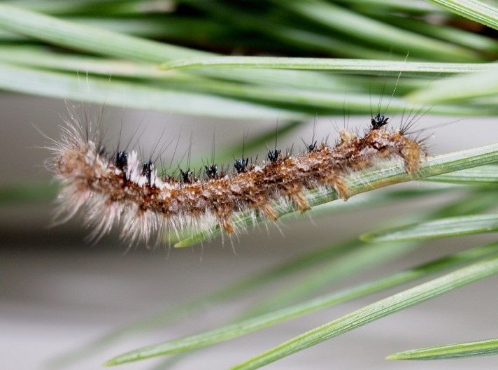 Weiblicher Falter und Raupe von Dendrolimus pini