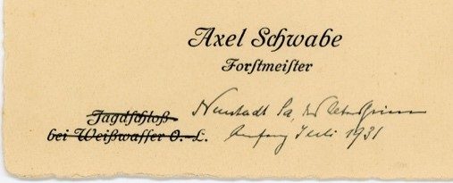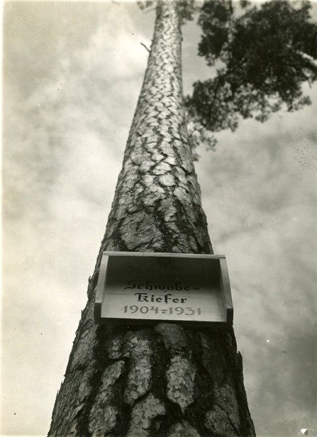 Forstmeister Axel Schwabe nahm am 30. Juni 1931 nach 27 Dienstjahren in Muskau seinen Abschied2 und lebte noch bis zum 1. Februar 1932 im Altenheim in Neustadt in Sachsen, wo er nach kurzer Krankheit im 70. Lebensjahr starb.3 Zur Erinnerung an seine Dienstzeit von 1904 bis 1931 erhielt eine ausgewählte Kiefer seinen Namen.