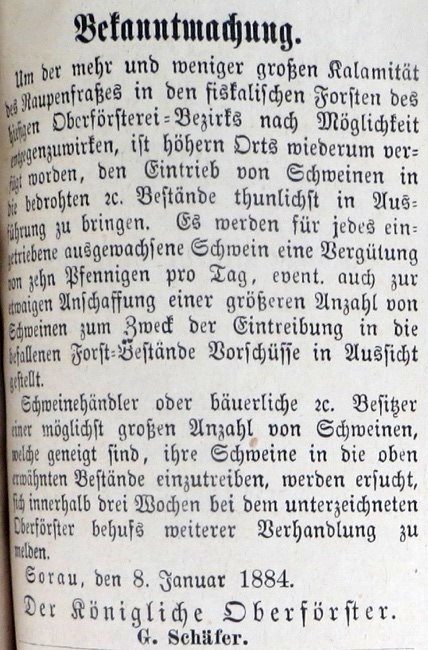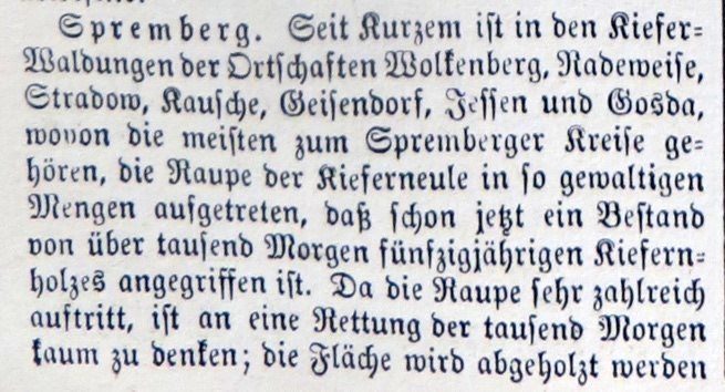 „Im Revier Schleife wurde Sonnabend Abend die beginnende Abwanderung über einen 8 m breiten sandigen Weg aus einem etwa 30jährigen Stangenholz, das fast kahl gefressen war, bemerkt, am Montag früh waren etwa 50 a einer zehnjährigen Kultur bereits kahl.“