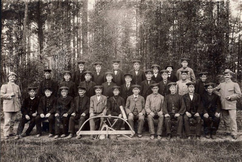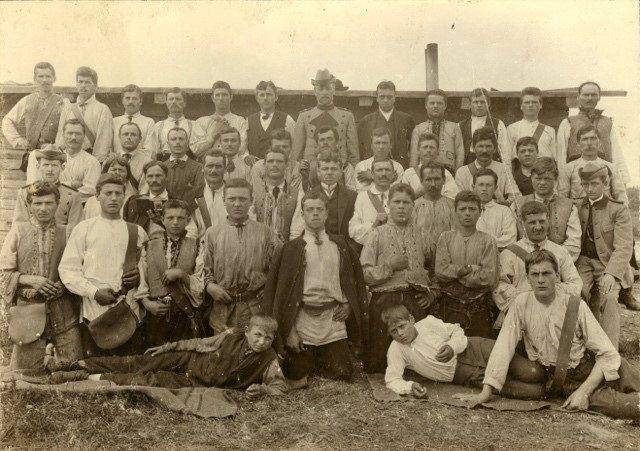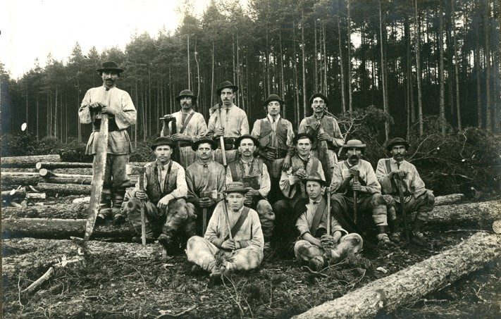 Auf dem ersten Foto ist eine Gruppe Forstarbeiter bestehend aus 41 Männern verschiedenen Alters in Sonntagskleidung zu sehen, wobei einige fast noch Kinder sind. Ihre Unterkunft ist als Holzbaracke mit Schornstein im Hintergrund zu erkennen. Drei gräfliche Forstangestellte in Uniform vervollständigen die Gruppe. Das zweite Foto zeigt 13 Arbeiter mit Äxten und Schrotsägen im Einschlag. Sie tragen Hüte, Pluderhosen, Kittelhemden und bestickte Westen sowie Wickelgamaschen und leichte spitze Lederschuhe. Über die ruthenischen Forsthelfer teilte der Revierförster Julius Doering 1908 mit, „daß die Leute allein nicht wissen, wann und wo sie geboren sind. Wenn sie von verschiedenen Seiten darüber befragt werden, machen sie verschiedene Angaben. An ihren Heimatorten zahlen sie keine Steuern, haben auch keinen Grundbesitz.“3