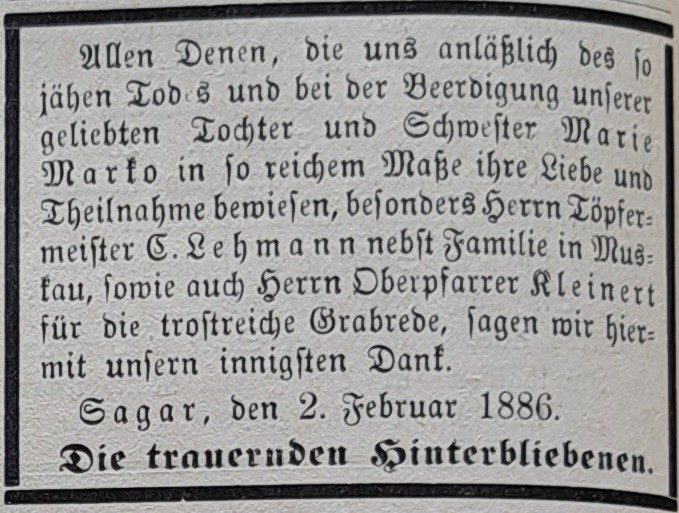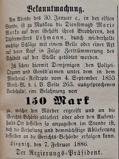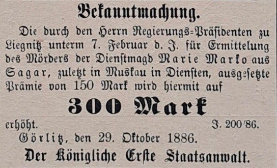 1928 landete die Bluttat erneut in den Schlagzeilen, worauf der Muskauer Anzeiger folgendes berichtete: „Die von einigen auswärtigen Zeitungen gebrachte Nachricht von der Aufdeckung eines hier vor 42 Jahren geschehenen Mordes an dem Dienstmädchen Marie Marko beruht auf einem Gerücht. Es ist in der Angelegenheit keine Verhaftung erfolgt.“4