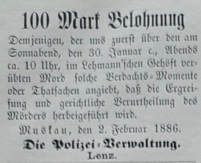 „Was seit Menschengedenken, ja seit einem Jahrhundert hier nicht vorgekommen – Am Sonnabendabend den 30. Januar 1886 hatte es sich ereignet: Ein Menschenleben war einem Meuchelmörder zum Opfer gefallen.“1