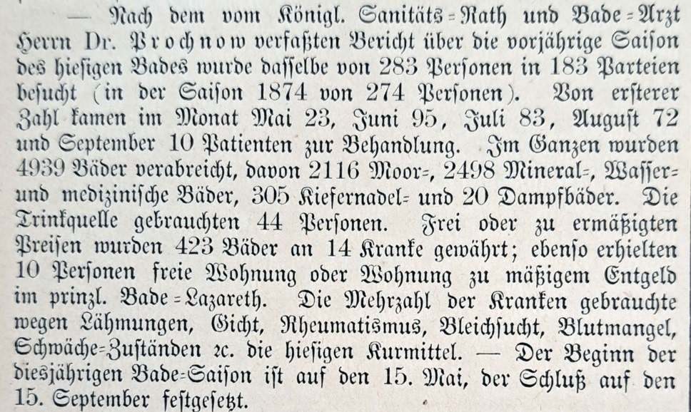 Für diese Badesaison ergeben sich unterschiedliche Zahlen: Laut dem bereits zitierten Badearzt Dr. Prochnow weilten 271 Gäste im Bad. Angaben aus dem Muskauer Anzeiger, die erst Ende Juni beginnen, so dass fast zwei Monate fehlen, ergeben in Summe 94 Gäste, darunter 21 aus Berlin und 13 aus Muskau. Diese zahlenmäßigen Unterschiede betreffen auch 1874 und 1875, die Prochnow mit 283 und 274 angibt. Das liegt daran, dass er die gesamte Saison, die vom 15. Mai bis 15. September andauerte, betrachten konnte, uns aber nur Anzeiger von Mai bis August zur Verfügung standen. Prochnow gibt auch detailliert Auskunft über die 1875 getätigten Behandlungen.