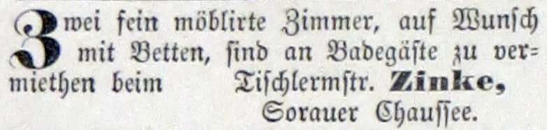 Im Muskauer Anzeiger werden 116 Gäste angegeben, davon 21 aus Berlin und 12 aus Muskau. Unter den Kurgästen aus Muskau sind wieder Baumschulinspektor Schrefeld und Fräulein Louise Petzold, aus Keula ist Revierförster Brotke genannt.