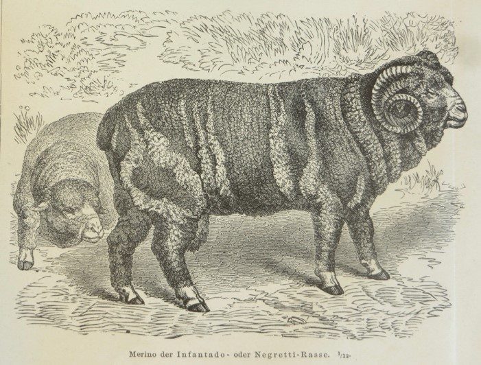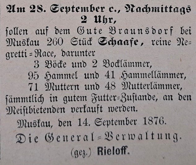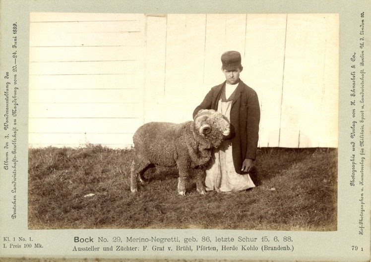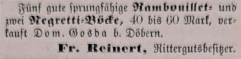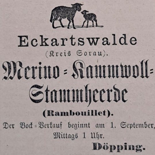 Graf Friedrich-Franz von Brühl (1848-1911) – Besitzer der benachbarten Herrschaft Forst-Pförten – betrieb die Intensivierung der Zucht von Merinoschafen. Sie bildete die Basis der Entwicklung der Textilindustrie der Stadt Forst und trug ihr den Namen „das deutsche Manchester“ ein. Die von Nordamerika stammenden Feinwoll-Schafe erreichten im Hochmittelalter Spanien. Von dort gelangten die Merinoschafe ab dem 18. Jahrhundert auch in deutsche Gebiete. Gerade die kargen Böden der Lausitz eigneten sich sehr gut zur Schafzucht. Die hiesigen Vorwerke verfügten Mitte des 19. Jahrhunderts über Negretti- und Rambouillet-Schafe, beides speziell gezüchtete Wolllieferanten. Durch eine intensivierte Zucht vergrößerte sich auch der Handel mit Schafen, wie es das Angebot des Dominiums Gosda 1879 zeigte. Ein Pächter aus Eckartswalde bei Sorau – heute Boruszyn/PL – meldete sich 1880 im Muskauer Anzeiger ebenfalls mit einem Inserat. 1887 kaufte der Obergärtner von Schloss Militsch – heute Milicz/PL – einen Bock aus der Herde der Muskauer Heidschnucken zum Preis von 24,50 M.8