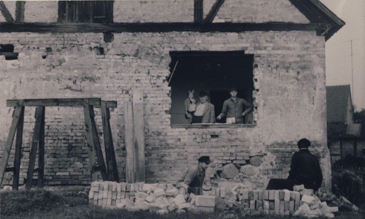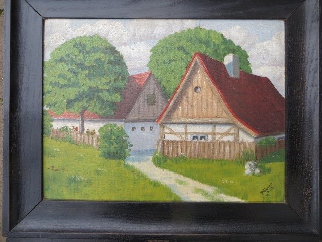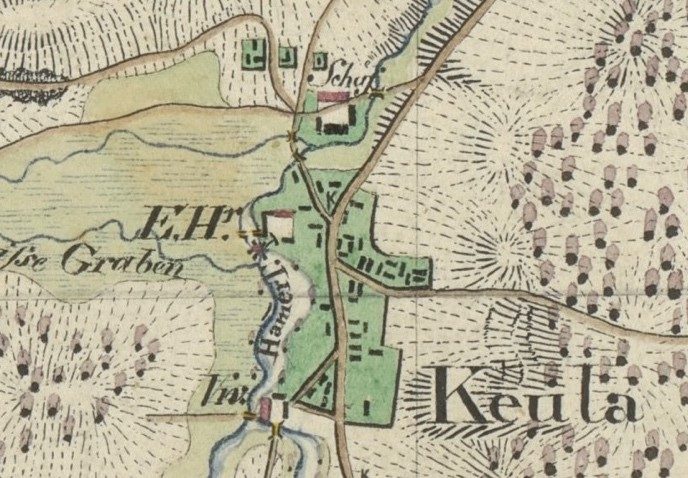 Im Sommer sollten die Freigänger als Zufütterung etwas Haferstroh und Heu erhalten, zum Herbst kamen noch Hafer, Kartoffeln, Kohl- und Runkelrüben aber auch Erbsen und Gerste hinzu. Dabei war zu beachten, dass Kartoffeln mehr Fleisch und Körnerfutter mehr Fett ansetzten.9 1829 rechnete der Inspektor des Vorwerks Berg pro Hundert Schafe mit 50 Zentnern Heu. Weiterhin gelangten Ölkuchen und Salz auf den Speisezettel.10 Beim Ölkuchen handelte es sich um den Rückstand beim Leinölpressen, der noch heute Verwendung als Viehfutter findet. Eine besondere Stellung nahm das neben dem Hammergut Keula gelegene Vorwerk ein. Unmittelbar am Flüsschen Legknitzka befand sich die sogenannte „Alte Schäferei“ bestehend aus Schafstall, Scheune und Schäferhaus. Der alte Weg über die Brücke führte damals noch direkt durch das Schäfereigelände – heute Schäferstraße 5 – wie es die Karte von 1823 und das Ölbild von 1925 zeigen. Nachdem die alte Schäferei ihre Funktion verloren hatte, dienten die Gebäude zu Wohnzwecken und später als Kindergarten, der mit dem Ausbau des Schafstalls Anfang der 1960er Jahre eine Erweiterung erfuhr. Auf dem Foto ist noch die gemauerte Wölbung des früheren Stalltors zu erkennen.