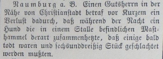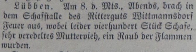 Oft fielen die hier vorwiegend in Holzbauweise errichteten Wohn- und Stallgebäude dem Feuer zum Opfer. Wenn es einen Schafstall traf, bedeute das einen besonders großen Verlust, wie 1883 in Lübben geschehen. Der zu jener Zeit fast gänzlich ausgerottete Wolf konnte keine Schäden mehr anrichten, jedoch der Hund als sein Urahne erwies sich ebenfalls als gefährlich, wie die Anzeige von 1884 in Naumburg am Bober – heute Nowogród Bobrzański/PL – berichtete.