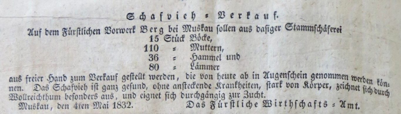 Die Schafzucht in der Standesherrschaft Muskau hat eine lange Tradition. Aus einer Liste des Jahres 1708 ist zu erfahren, dass es neben den herrschaftlichen Schafen auch Bauernschafe gab, somit auch die Dorfbewohner Schafe hielten, die dem Bauernschäfer übergeben wurden. Das betraf in Halbendorf, Trebendorf und Schleife eine Menge von jeweils 200, in Sprey, Rohne und Mulkwitz von jeweils 100 Bauernschafen. In Weißwasser und Nochten befanden sich auf der Liste neben den herrschaftlichen ebenfalls Bauernschafe. Die in den Vorwerken der Dörfer Eselsberg, Groß Düben, Gablenz, Publick, Haide, Braunsdorf, Skerbersdorf, Berg, Weißwasser, Zibelle und Keula tätigen herrschaftlichen Schäfer sind allerdings ohne Angaben der Herdengrößen aufgeführt.2 Nimmt man von diesen insgesamt 19 Herden einen Durchschnitt von 150 Tieren, so ergäbe es eine ungefähre Menge von knapp 3.000 Schafen. Daraus lässt sich die Bedeutung der Schafhaltung auf dem Gebiet der Standesherrschaft Muskau schon Anfang des 18. Jahrhunderts erahnen. Besser belegte Angaben stehen aus dem Vorwerk Berg des Jahres 1829 zu Verfügung, als die Herde aus 600 Schafen bestand, wobei eine frühere Herde von 900 Schafen Erwähnung findet.3 Insgesamt übte die Herrschaft Kritik an der hiesigen Schafzucht: „Für die Veredelung der Schäferey ist ebenfalls wenig gethan; nur die Schaafe auf Vorwerk Berg, welches administrirt wird, stehen in der Veredelung und es muß mit der Zeit aus dieser Branche eine große Vermehrung der Herrschaftlichen Revenuen [regelmäßige Einkommen] erreicht werden.“4 Wenige Jahre danach suchte die Herrschaft den Bestand des Vorwerks Berg zu reduzieren und inserierte den Verkauf von insgesamt 241 Stück Schafvieh in den Wochenblättern von Görlitz, Sagan und Cottbus. Die danach noch restlichen 20 Brackschafe – mangelhafte Schafe, die die Herde verlassen müssen – kaufte der Pächter Henschel vom Gut Jämlitz zum Stückpreis von 15 Silbergroschen.5