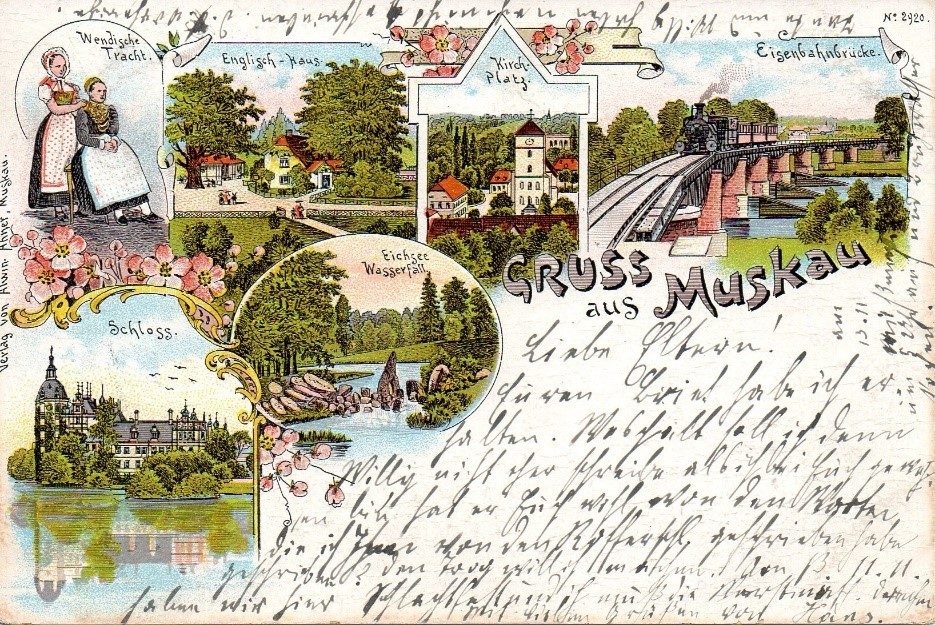 Per Brief erreichte uns vom Heimatbund und Geschichtsverein Herzogtum Lauenburg e. V. eine Ansichtskarte mit Muskauer Motiven, gestempelt 13.11.1911