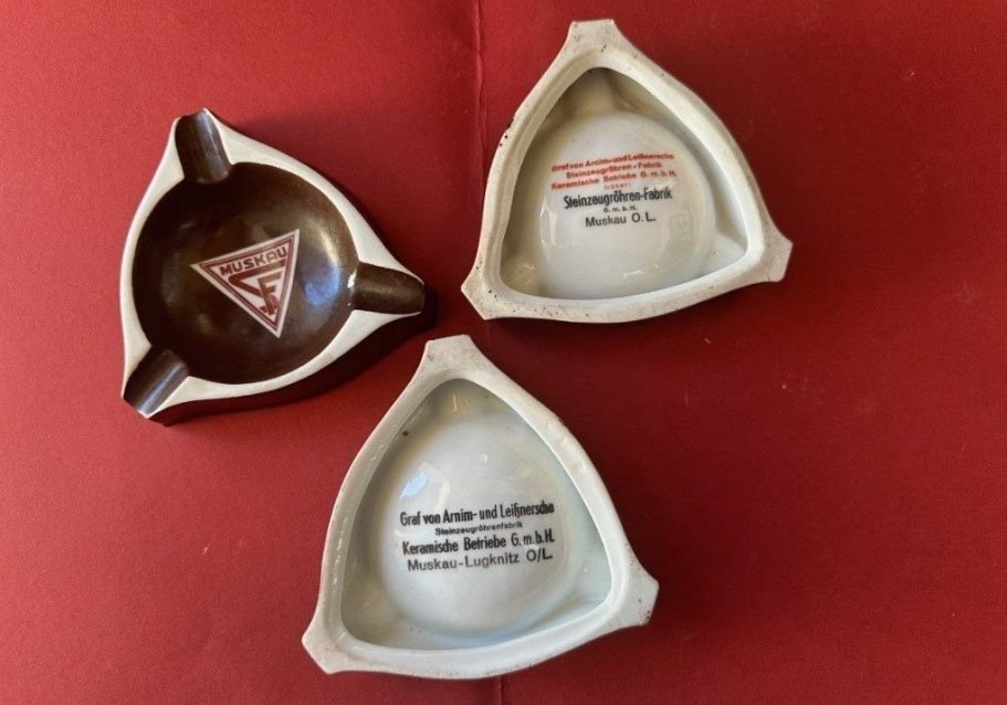 Frau Martina Herzig aus Krauschwitz übergab drei Werbe-Aschenbecher der Steinzeugröhrenfabrik Muskau/Lugknitz, die zwar dort nicht gefertigt wurden, denn sie sind aus Porzellan, deren Rückseite aber den Firmennamen um 1920 und seine Änderungen nach 1924 wunderbar dokumentieren.