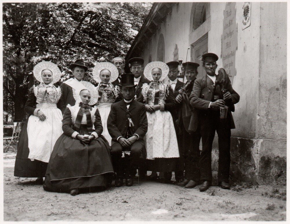 1901 ehrten die Grafen von Arnim den Parkschöpfer Fürst Pückler durch das Aufstellen eines Findlings mit einem Pückler-Bronzerelief. Die Aufnahme aus dem Jahr 1902 von Herrn Schaar ist also ein sehr aktuelles Zeitzeugnis. Das Foto der Mittelstraße 1902 zeigt die Bebauung beidseits der Straße. Die wendische Hochzeitsgesellschaft fotografierte R. Schaar im Jahr 1903 vor dem Restaurant Bockkeller, das zu der Zeit auch als Standesamt diente.