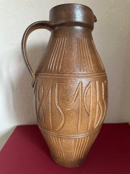 Oft fertigten Töpfer, Glasgraveure oder Holzgestalter zu Jubiläen der Stadt und des Parks besondere Erinnerungsstücke, so auch die Töpferei von Erna Pfitzinger im Jahr 1965 zum 150-jährigen Bestehen des Muskauer Parks. Andreas Pfitzinger, ihr Enkel, hatte 1973 als junger Meister die Töpferei übernommen und überließ uns diesen vierzig Zentimeter hohen Krug.